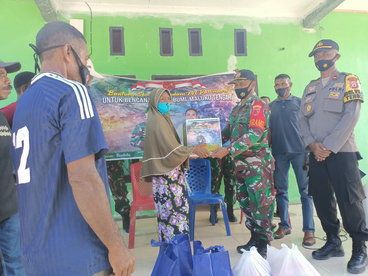 Untuk meringankan beban masyarakat yang terdampak Gempa, Kodam XVI/Pattimura melalui Kodim 1502/Masohi bergerak ke beberapa titik lokasi pengungsian (Posko pengungsian SD Negeri Dusun Mahu, Desa Sounolo, Pesantren Darul Hadis Markiz Talaka, Negeri Haya) guna menyalurkan bantuan kemanusiaan berupa 250 paket sembako, Kamis (24/06/2021).