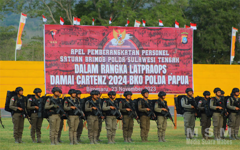MediaSuaraMabes, Palu – Kapolda Sulawesi Tengah (Sulteng) Irjen. Pol. Dr. Agus Nugroho, S.I.K., S.H., M.H. memimpin langsung Apel pemberangkatan 110 Personel Satbrimob Polda Sulteng yang akan melaksanakan Latihan Pra Operasi Operasi (Latpraops) Damai Cartenz 2024 BKO Polda Papua.