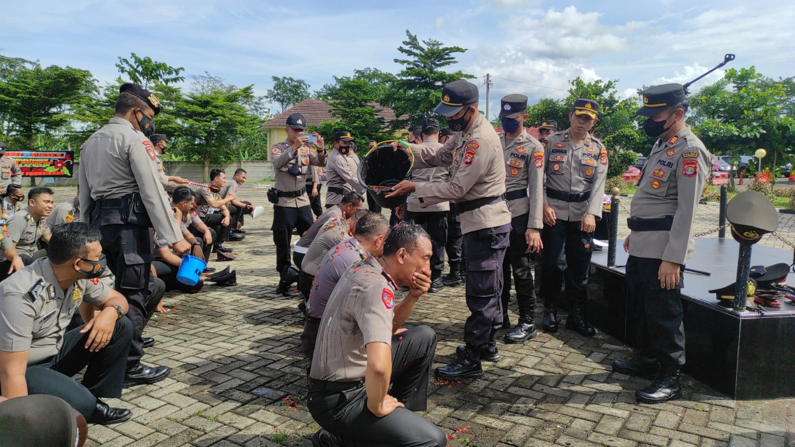 Upacara Korps Raport kenaikan pangkat personel Polres Pesawaran diakhiri dengan tradisi penyiraman Air Kembang dan Potong Tumpeng oleh Wakapolres Pesawaran dan diikuti oleh Para Pejabat Utama (PJU) Polres Pesawaran di Halaman Mapolres Pesawaran. ( Rizal/Lilis)