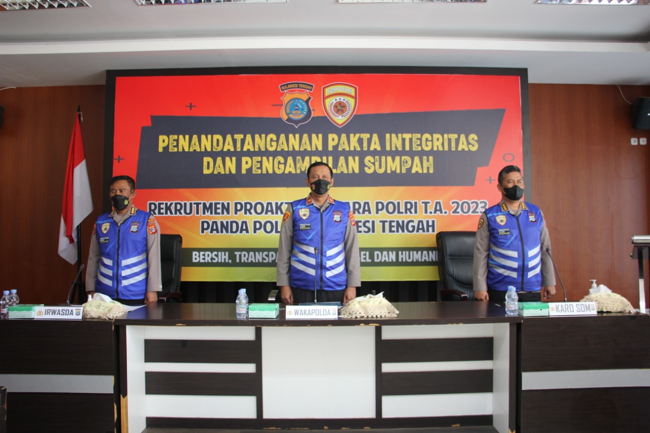 Sebanyak 65 pemuda-pemudi Sulteng hari ini mengikuti penanda tanganan pakta integritas dan pengambilan sumpah panitia, peserta dan orang tua yang dipimpin oleh Wakapolda Sulteng Brigjen Polisi Hery Santoso, SIK, MH di Aula lantai I Polda Sulteng, Senin (17/10/2022) sore