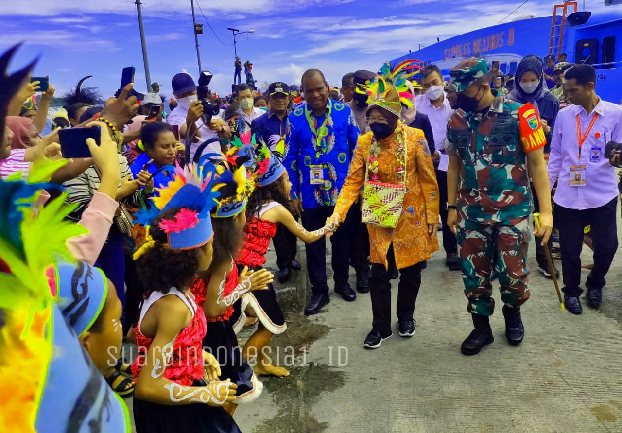 Tiba di negeri sejuta bakau menteri mantan walikota Surabaya disambut langsung oleh Bupati Waropen Yermias Bisai, Wabup Lamek Maniagasi, Forkopimda bersama staf ahli Kementerian sosial, Benhur Tommy Mano di Pelabuhan Pedemani Waren.