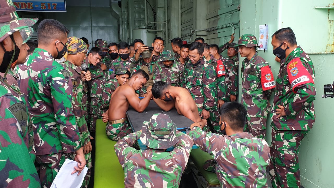 SuaraMabes, Ende – Sorak sorai dan yel-yel dari ratusan prajurit Petarung Korps Marinir yang menjagokan dan mendukung salah satu personelnya dalam ajang adu panco antar prajurit Koprs Marinir yang diadakan di atas geladak Heli Kapal Perang Republik Indonesia KRI Teluk Ende 517.Senin, (12/04/2021).