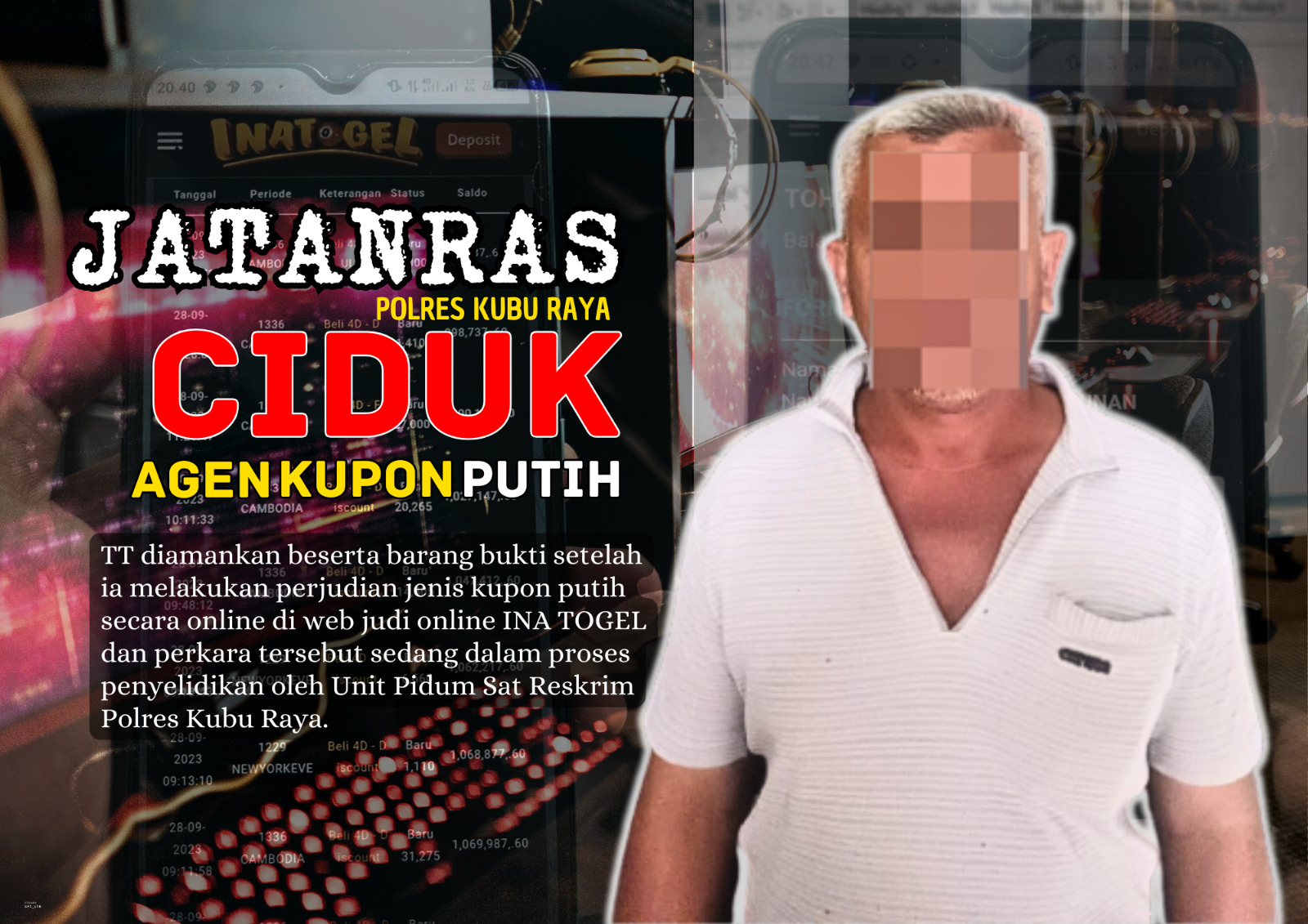 MediaSuaraMabes, Kubu Raya Kalbar – Tim Jatanras Polres Kubu Raya membekuk seorang Pria yang menjadi agen judi kupon putih secara online di Pasar Alas Kusuma Desa Kuala Dua Kecamatan Sungai Raya Kab Kubu Raya pada Kamis 28 September 2023 pukul 19.00 WIB. Pria itu berinisial TT (52) warga Kabupaten Kubu Raya.