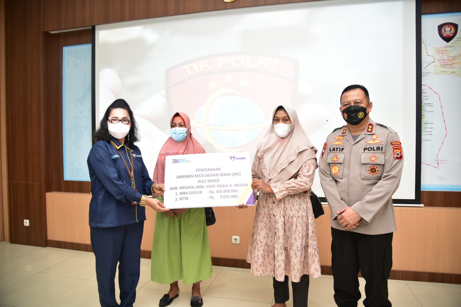 MediaSuaraMabes, Maluku – Ahli waris dari Brigpol Anumerta Mohamad Faisal Akmi Heluth, menerima santunan resiko kematian khusus dari PT. Asabri Cabang Ambon, Senin (7/3/2022). Ahli waris penerima santunan resiko kematian khusus dari PT Asabri adalah istri almarhum, Ayu Lestari dan Ibu almarhum, Aisah Kabau.