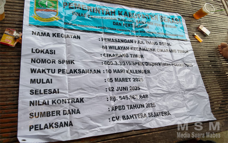 MediaSuaraMabes, Kab. Bekasi – Proyek pemasangan PJUL tiang botol di wilayah Cikarang Timur yang dikerjakan oleh CV.BAHTERA SEJAHTERA dengan nomor SPMK : 000.3.3/319/SPMK/Disperkimtan-PSU/III/2025 dalam waktu pelaksanaan 90 hari kalender dengan nilai kontrak: 545.067.648 APBD tahun 2025 diduga tidak sesuai spesifikasi dan RAB.