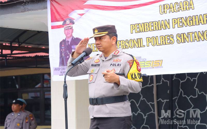 MediaSuaraMabes, Kalbar – Polres Sintang, AKBP Dwi Prasetyo, S.I.K memberikan penghargaan kepada personel yang berprestasi dalam upacara yang dilaksanakan di halaman Polres Sintang, Senin pagi (13/11/23).
