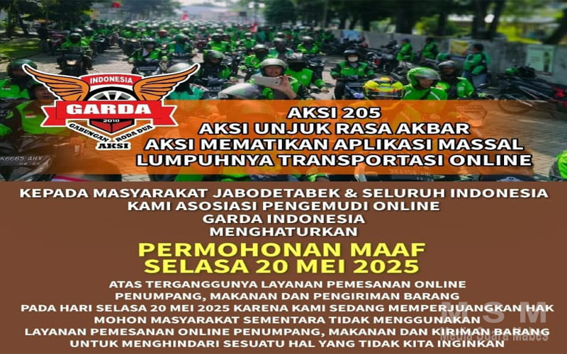 MediaSuaraMabes, Jakarta – Asosiasi Pengemudi Online “Garda Indonesia” menyampaikan permohonan maaf kepada masyarakat Jabodetabek dan seluruh Indonesia atas terganggunya layanan transportasi daring, pemesanan makanan, dan pengiriman barang yang terjadi pada Selasa, 20 Mei 2025.