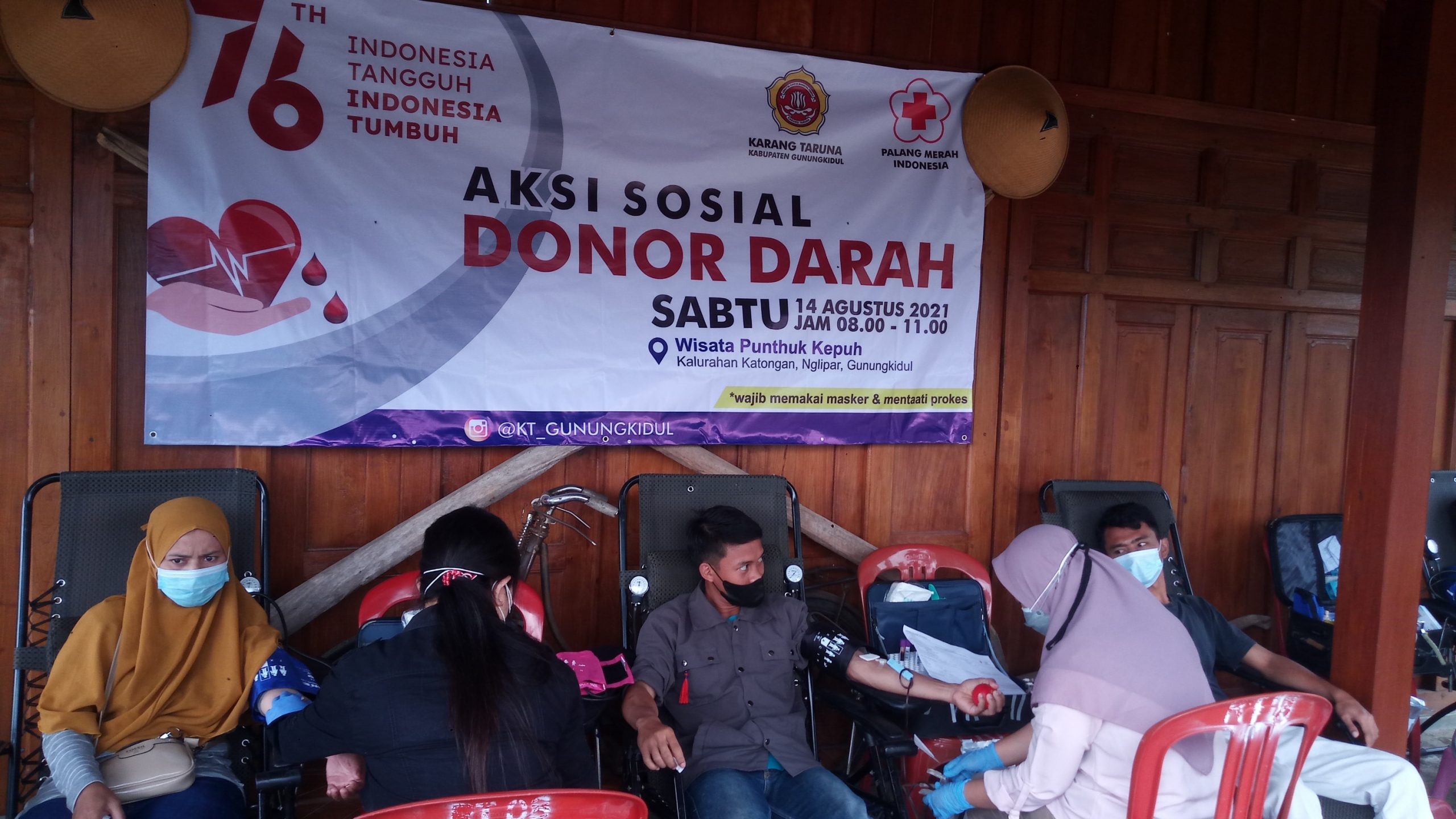 Momentum peringatan Hari Ulang Tahun (HUT) ke-76 Kemerdekaan Republik Indonesia (RI) Tahun 2021, Karang Taruna Kabupaten Gunungkidul menggelar aksi sosial donor darah yang bekerjasama dengan Unit Transfusi Darah Palang Merah Indonesia (PMI) dan Sedulur Panter Gunungkidul.
