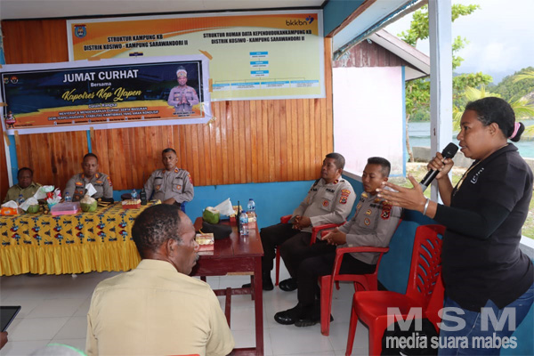 MediaSuaraMabes, Yapen – Kegiatan Jumat Curhat yang merupakan program Dumas Presisi Polri, mendapatkan apresiasi dari aktivis perempuan di Kabupaten Kepulauan Yapen yang hadir secara langsung dalam kegiatan Jumat Curhat Polres Kepulauan Yapen bersama masyarakat di Kampung Sarawandori II Distrik Kosiwo. Jumat (27/1/2023.