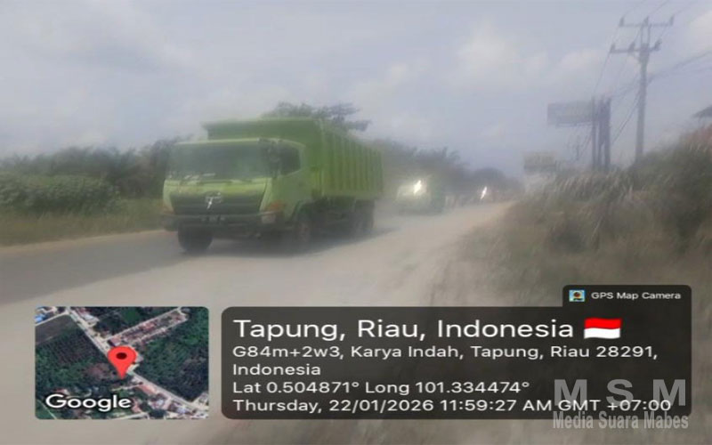 MediaSuaraMabes, Kampar – Masyarakat Desa Karya Indah, Jalan Lintas Garuda Sakti Km 6, Kecamatan Tapung, Kabupaten Kampar, Riau, kembali resah akibat polusi debu pekat dan kerusakan jalan yang disebabkan truk bermuatan tanah dari aktivitas tambang galian C ilegal.