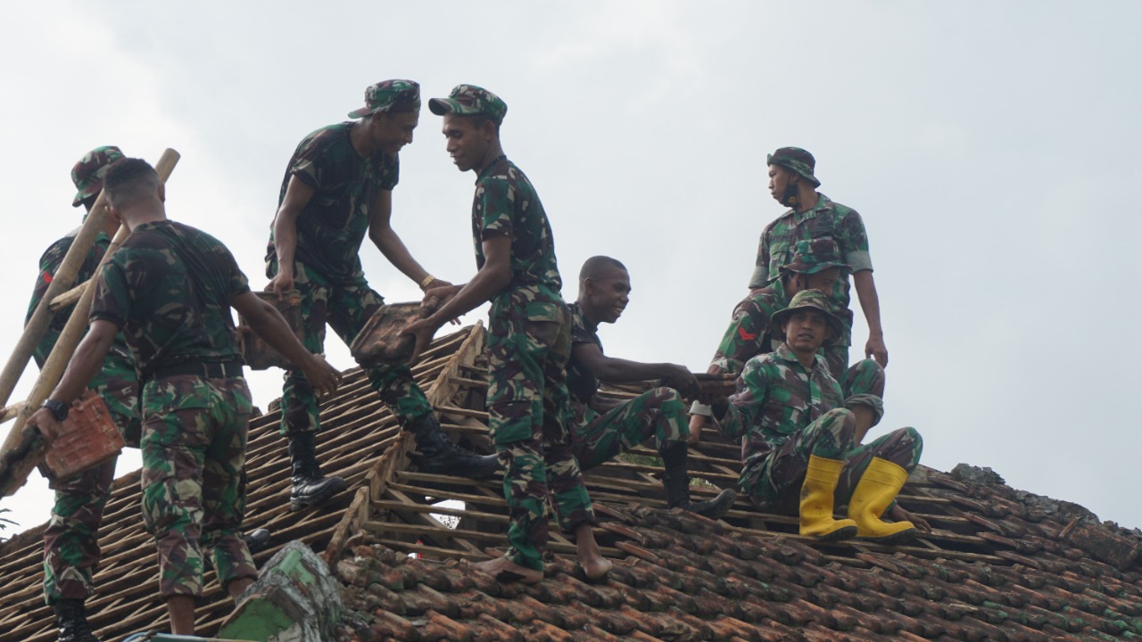 Dengan penuh semangat anggota melaksanakan gotong-royong dan saling bahu-membahu menurunkan genteng agar pembongkaran cepat dilakukan dan pembangunan dapat dimulai.