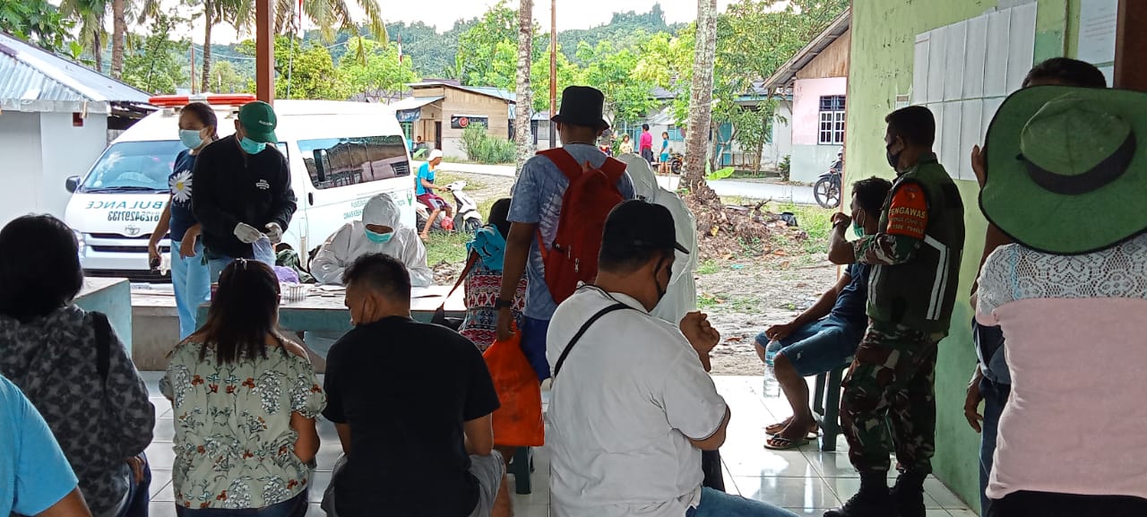 MediaSuaraMabes, Morotai – Dalam rangka memutus mata rantai penularan covid-19, Kodim 1508/Tobelo melalui Babinsa Koramil 1508-07/Wayabula Pelda Paulus. O. Lenahatu mendampingi petugas Puskesmas melakukan pemeriksaan Swab Antigen kepada penumpang KM Beringin Jaya dan KM Tiga Putri bertempat di Dermaga Posi Posi Rao