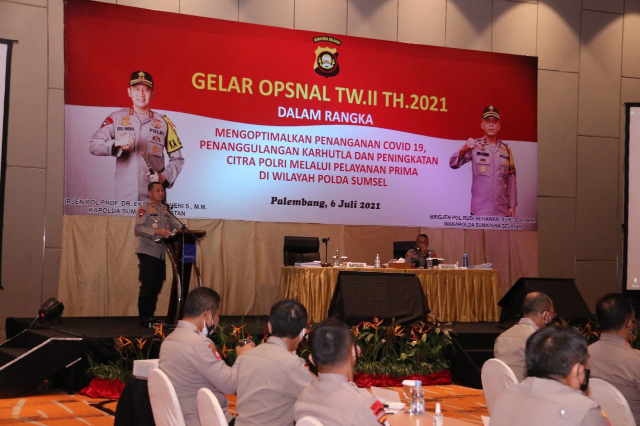 MediaSuaraMabes, PALEMBANG – Untuk mengoptimalkan penanganan Covid-19 di Sumatera Selatan (Sumsel), Kepolisian Daerah (Polda) Sumsel gelar rapat opsnal triwulan II tahun 2021 di hotel Novotel Palembang, Selasa (6/7).