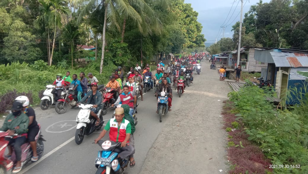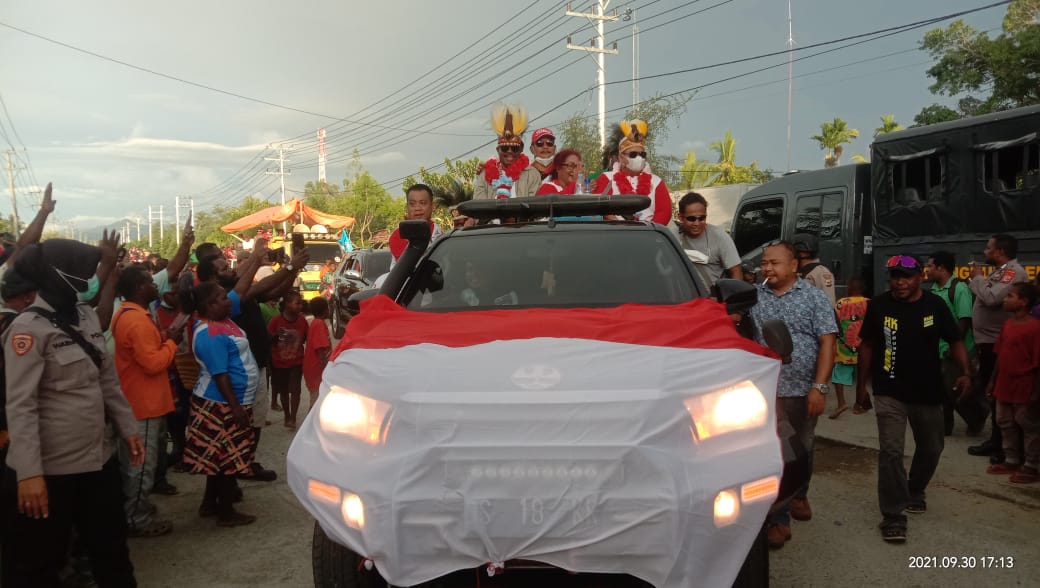 MediaSuaraMabes, Nabire – Ribuan massa Pendukung Pasangan Bupati dan wakil Bupati No. urut 2 padati jalan – jalan di kota Nabire, terlihat dari pukul 12:00 siang Waktu indonesia timur, warga masyarakat Nabire yang begitu antusias untuk menyambut kedatangan Bupati dan Wakil Bupati, pasca putusan sengketa PSU di MK pada rabu 29 september 2021 di Jakarta kemarin, sudah memadati beberapa ruas jalan di Kota Nabire,