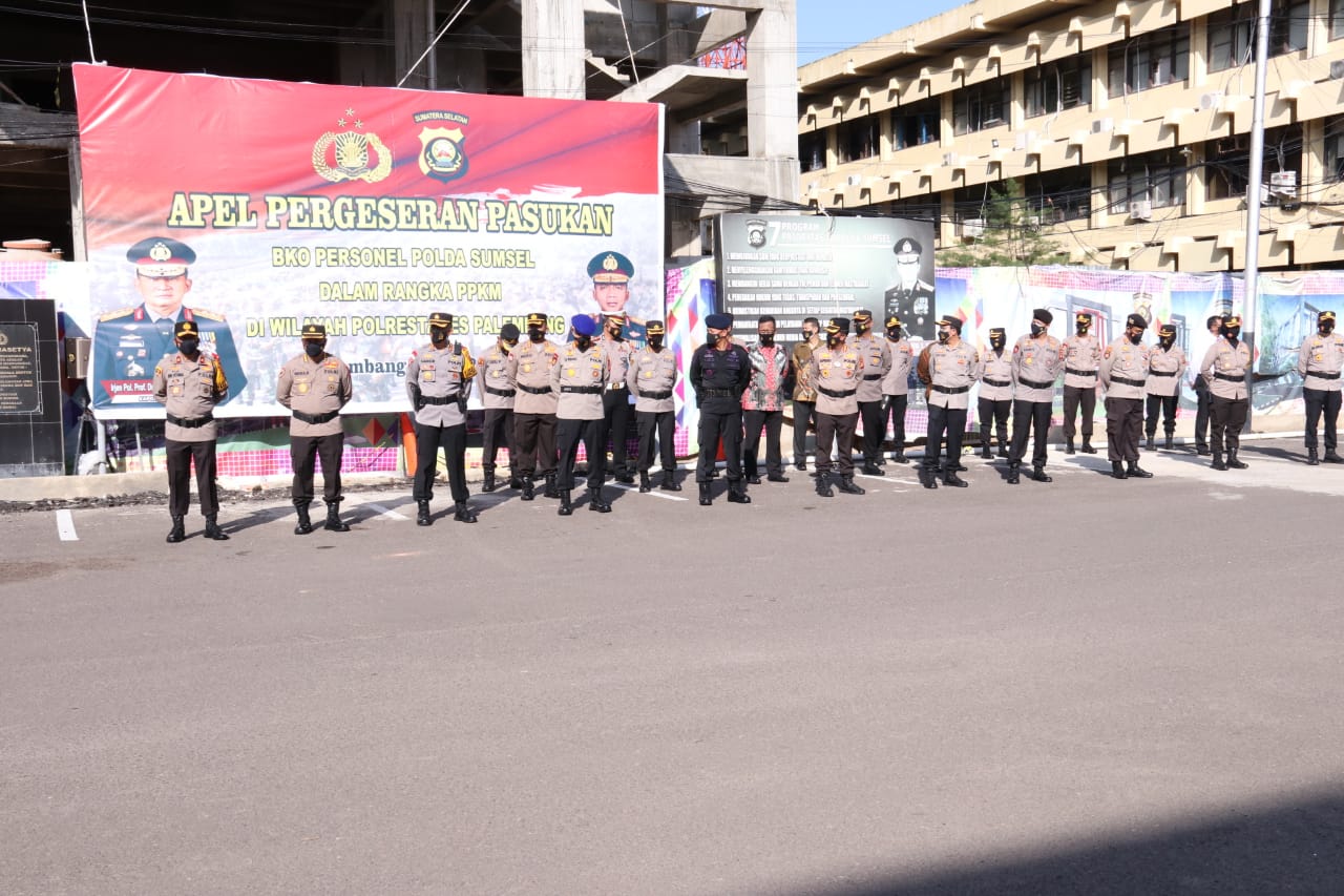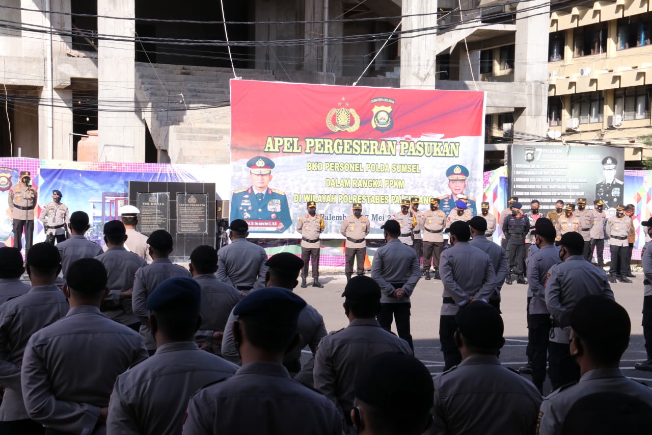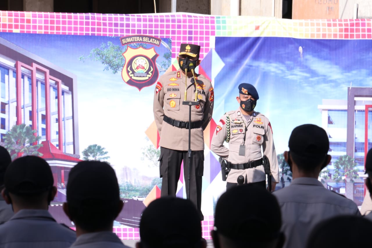 Suaramabes, Palembang – Kapolda Sumsel Irjen Pol Prof Dr Eko Indra Heri S MM didampingi Wakapolda Sumsel Brigjen Pol Rudi Setiawan Sik SH MH dan PJU Polda Sumsel memimpin apel Gelar pergeseran Personel Polda Sumsel BKO Polrestabes Palembang dilapangan Apel Polda Sumsel , Jumat (07/05/2021).