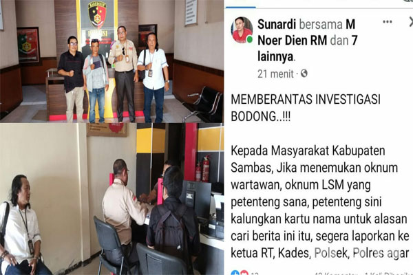 “Sementara itu Revie A selaku Ketua Ikatan Wartawan Online Indonesia (IWO-I) DPD Kabupaten Sambas menyatakan dengan tegas dan merasa postingan saudara Sunardi telah menghina profesi Wartawan dan LSM, untuk itu saya dan bersama Rekan-rekan Wartawan yang mewakili mendatangi Polres Sambas untuk buat laporan, dan berharap agar Polres Sambas dapat memanggil saudara Sunardi untuk mempertanggung jawabkan postingannya di akun facebook pribadi nyaitu,”Tegasnya.