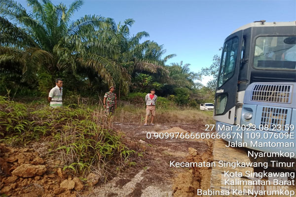 Hadir dalam pemantauan dan pembuatan jalan,Lurah Nyaromkop Bpk Mahmudi Febrianto,A.md,bersama staf kelurahan, Babinsa kelurahan Nyaromkop Serda Ari Prabowo, Babinkamtibmas Bripka Sianifar, ketua RT 09 Mencong bpk Andi. (Pendim 1202/Skw)