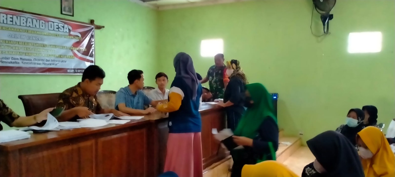Babinsa Sertu Munawar anggota Koramil 11/Tahunan jajaran Kodim 0719/Jepara melakukan kegiatan pendampingan atau pengawalan jalannya penyaluran Bantuan Langsung Tunai (BLT) BBM kepada Keluarga Penerima Manfaat (KPM) yang berlangsung di Balai Desa Kecapi, Kecamatan Tahunan, Kabupaten Jepara, Jawa Tengah. Jumat, (16/9/2022).