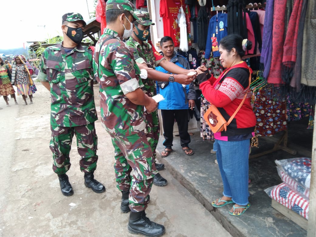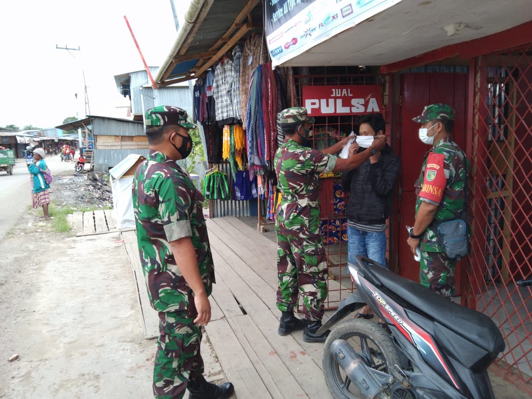 MediaSuaraMabes, Moanemani — Bertempat di Desa Kimupugi Distrik Kamuu,Babinsa 1705-04/Moanemani, Sertu Arianda dan Sertu Ahlan melaksanakan pembagian masker kepada masyarakat yang melaksanakan aktifitas dan tidak menggunakan masker di Kabupaten Dogiyai. Jum’at, (14/01/2022)).
