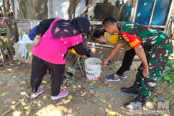 MediaSuaraMabes, Jepara — Sebagai bentuk antisipasi berkembang-biaknya nyamuk Demam Berdarah Dengue (DBD), Babinsa Sertu Margiyanto anggota Koramil 12/Donorojo bersama Bidan Desa Tulakan dan Kader Posyandu Desa Tulakan melakukan tindakan antisipasi dengan kegiatan pemberantasan sarang nyamuk (PSN).