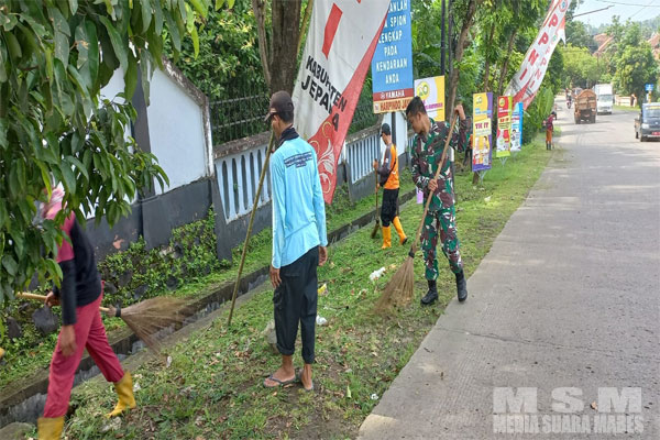 MediaSuaraMabes, Jepara – Guna mewujudkan kebersihan dan kelestarian lingkungan, Babinsa Serka Sarif anggota Koramil 01/Jepara bersama masyarakat dan petugas kebersihan melaksanakan kerja bakti pembersihan rumput liar di pinggir jalan.