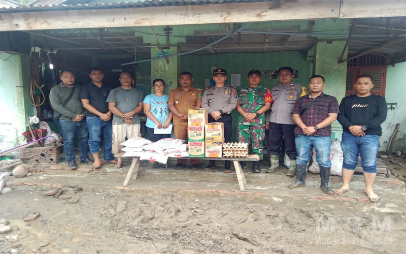 Kapolres Langkat AKBP Faisal diwakili Kapolsek Salapian IPTU Hotdiatur AW Purba Strk segera turun ke lokasi dan membantu masyarakat yang tertimpa musibah banjir bandang dengan membantu sembako berupa