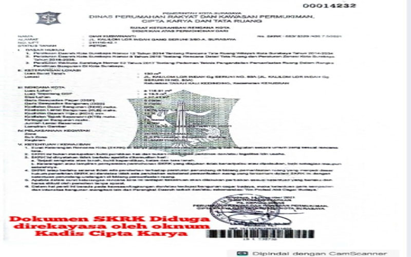 Surat Keterangan Rencana Kota (SKRK) diterbitkan oleh Dinas Cipta Karya Pemkot Surabaya tahun 2021 setelah terpidana Sudarmanto membangun Rumah gedung di atas tanah yang disewakan yang awalnya tanpa IMB dan berdampak pada kerusakan beratkan pada rumah M Sholeh.