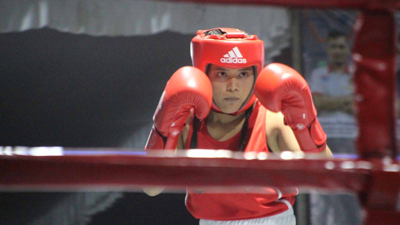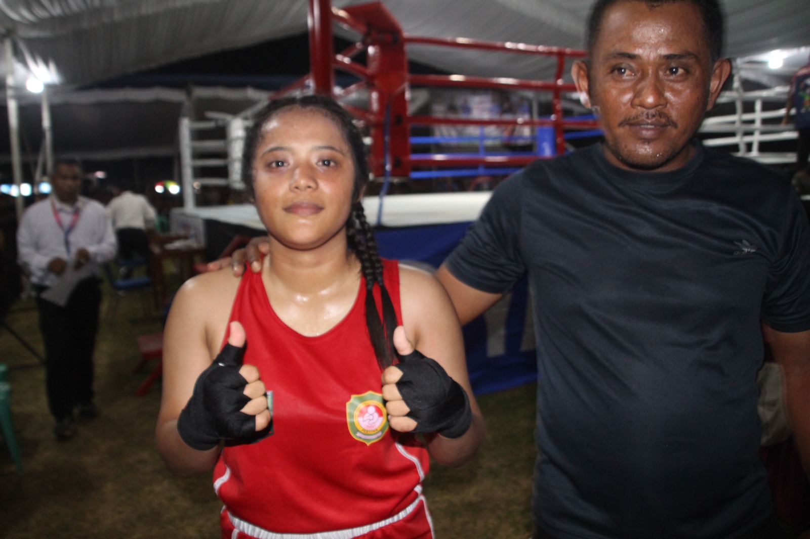 Rosiana memperoleh emas setelah berhasil mengalahkan Miranti atlet Tinju Bangka Selatan pada kelas 57 kg pada pertandingan di Lapangan Gelora Muntok Bangka Barat, Minggu (27/8/23) Malam.