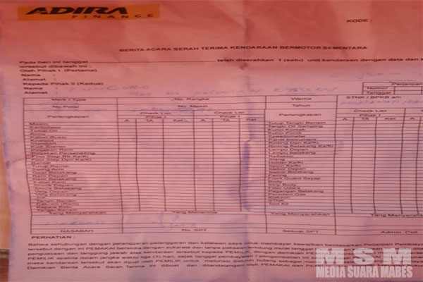 Selanjutnya korban mendatangi kantor Leasing Adira cabang Cibinong yang mana sebagai kantor pembiayaan motor Honda Beat B 4212 SNN, setelah di konfirmasi dan di tunjukan Form Berita Acara Serah Terima Kendaraan Bermotor Sementara yang di tanda tangani korban secara paksa, menyatakan bahwa pihak Adira cabang Cibinong belum ada perintah apapun dan formulirnya juga dinyatakan Palsu yang sudah tidak dipakai lagi.