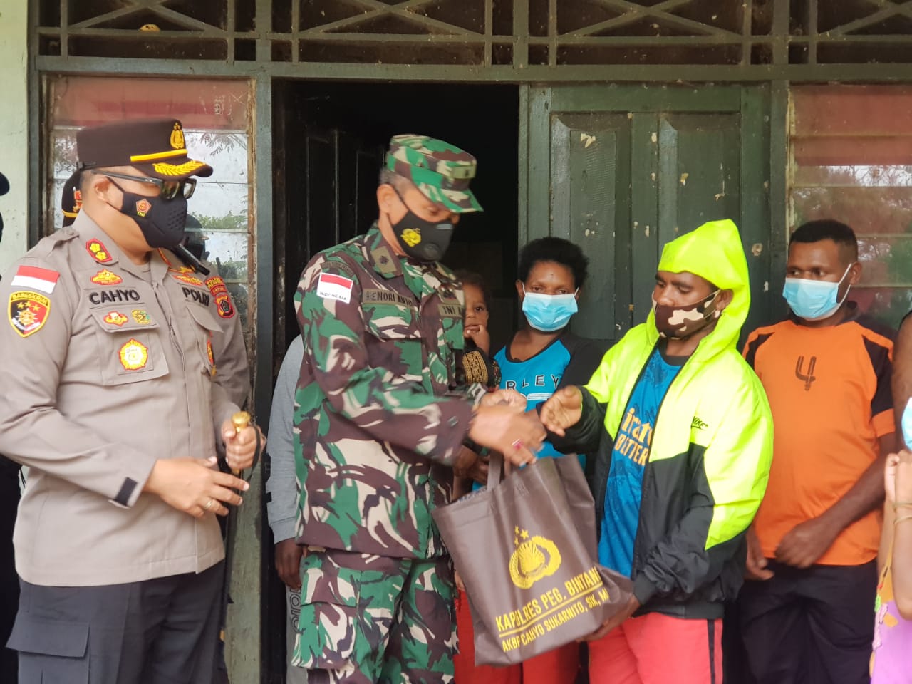 Aparat gabungan mengunjungi perumahan warga yang bermukim di Distrik Bulankop dan memberikan sebanyak 30 paket sembako kepada warga yang ditemui. Kapolres Pegunungan Binang menjelaskan bahwa saya bersama anggota yang hadir disini untuk memberikan bantuan sosial kepada masyarakat sekalian sebagai bentuk kepedulian Polri terhadap masyarakat yang terdampak pandemi Covid-19.