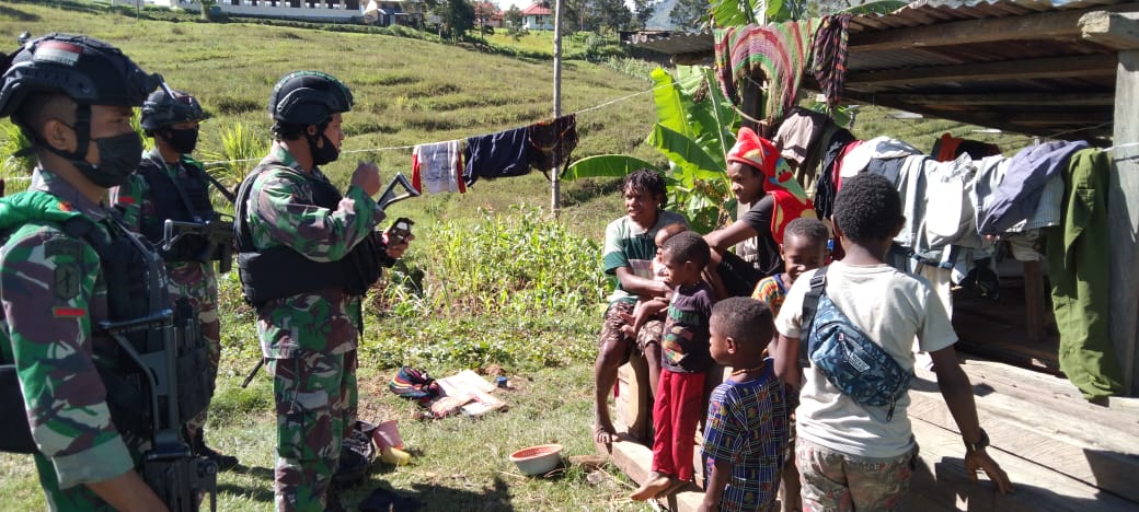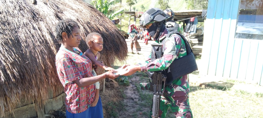 Dipimpin oleh Sertu Merne beserta 7 personel pos membagikan beberapa tas sekolah dan baju layak pakai kepada masyarakat yang berada di Desa Gumagame, Distrik Yiginua, Kabupaten Lanny Jaya, Papua, Rabu (25/08/2021).