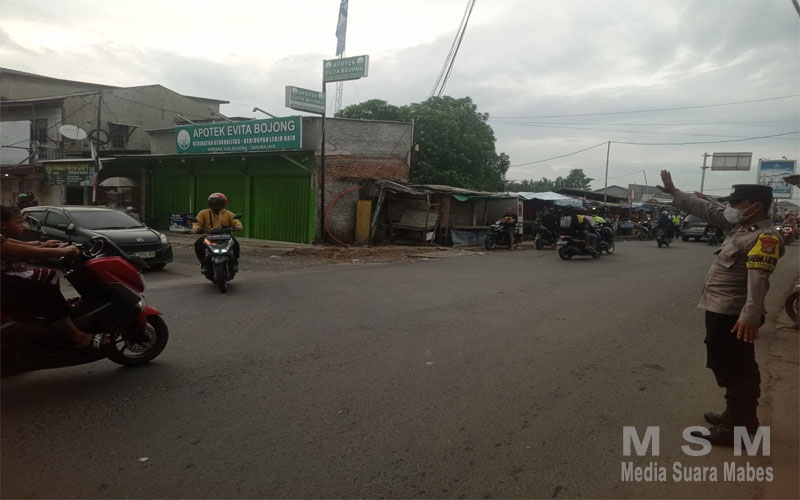 MediaSuaraMabes, Tarumajaya – Guna menciptakan kelancaran dan ketertiban arus lalu lintas di pagi hari, Bhabinkamtibmas Desa Setiamulya, Aipda Arif Pramono, bersama anggota Korlantas melaksanakan pengaturan lalu lintas di pertigaan Pasar Bojong, pada pagi hari.