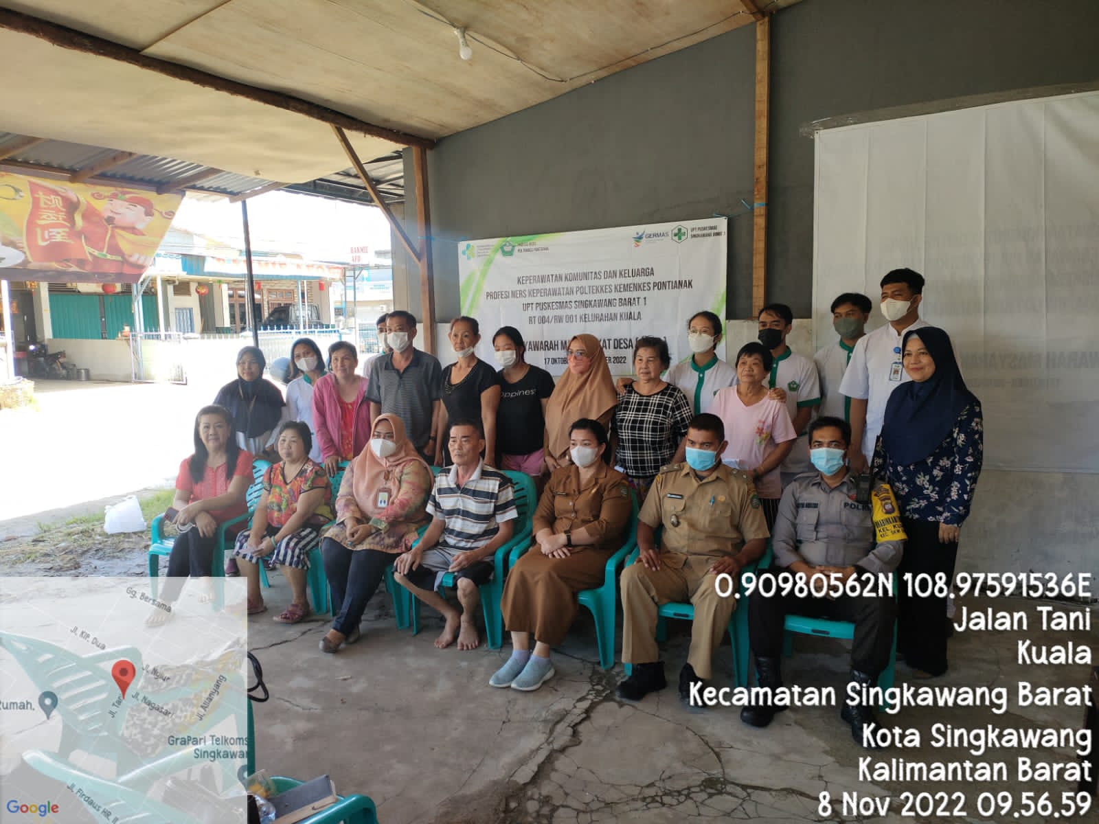 Adapun yang hadir pada acara tersebut, sebagai berikut Ibu Dr. Yosepha Yessi / Kepala Puskesmas Singkawang Barat 1, Bapak Muaz, S.Sos / Lurah Kuala, Ns. Revani Hardika, M. Kep / Dosen Pembimbing Akademik Poltekkes Pontianak, Aipda Anton Ariatna / Bhabinkamtibmas Kel. Kuala, Warga Rt 04 ± 15 Orang.