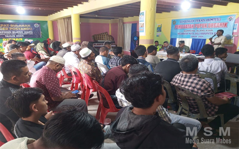 MediaSuaraMabes, Pidie – Geusyik Perangkat Desa Gampong Blang Asan, Edi Sutrisno Geusyik, Pensiunan Pertanian, Ir. Mukhlis dan Pensiunan Perkebunan Razali Serta Perwakilan Danramil dan Polsek Berkerja sama dengan Dinas Pertanian melalui Bidang Penyuluhan Pidie melakukan pelatihan serta Bimbingan Teknis (BIMTEK) pengelolaan pupuk organik bagi pemberdayaan masyarakat, secara bertahap dan terjadwal, Acara Bimtek dilakukan di Gedung Posyandu Gampong Blang Asan, Kec. Kota Sigli, Kab. Pidie, Sabtu 14/12/24.
