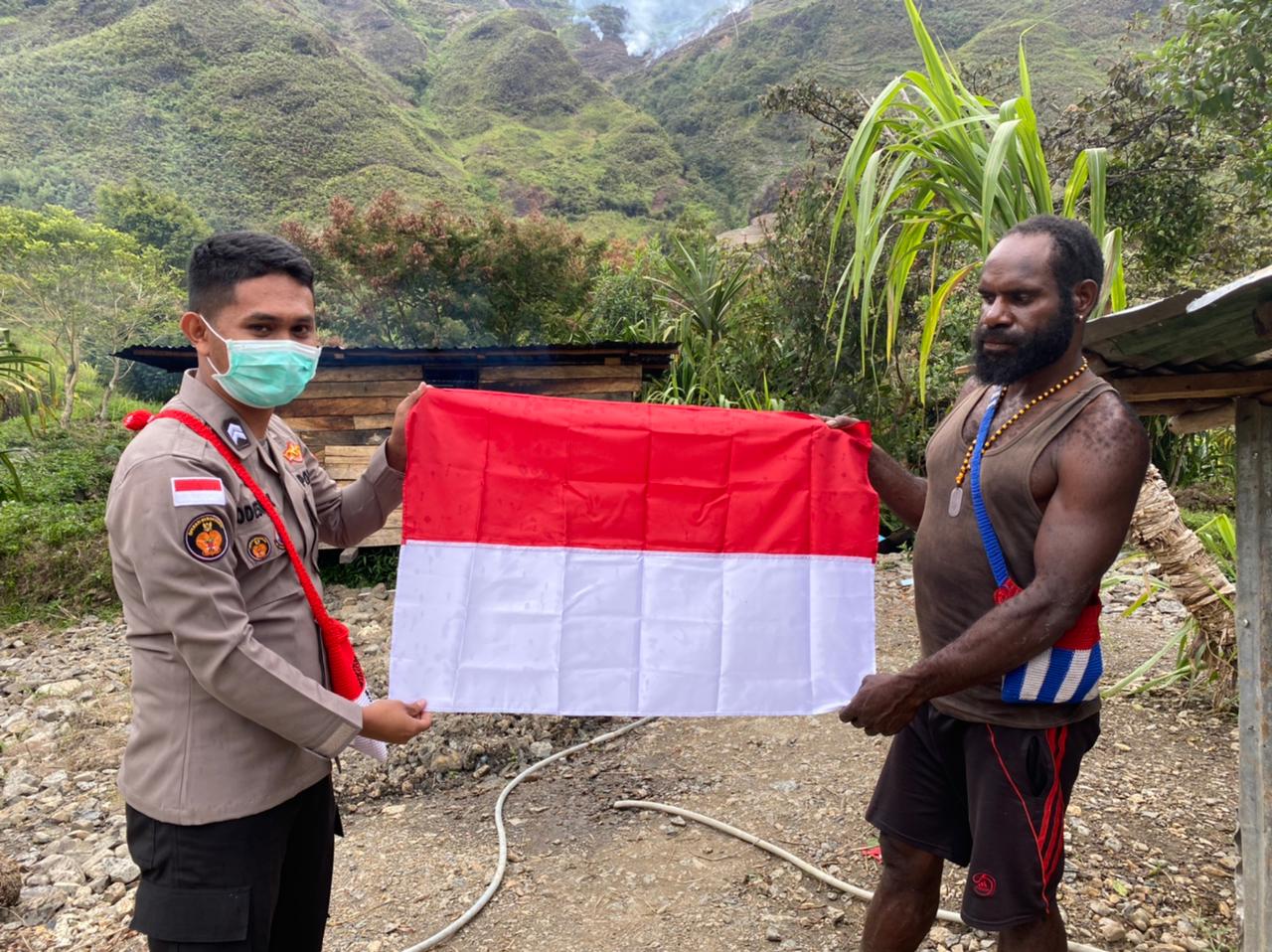 SuaraMabes Jayapura – Bertempat di Kampung Wuyukwi Distrik Mulia Kabupaten Puncak Jaya, Binmas Noken Polres Puncak Jaya menyerahan bendera merah putih kepada Kepala Kampung Pilia.9/8/2021.