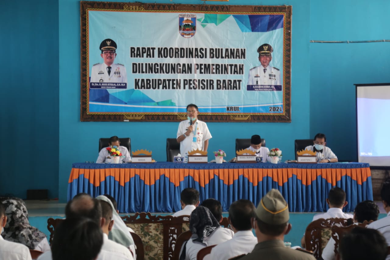MediaSuaraMabes, Pesisir Barat – Bupati Pesisir Barat DR Drs. Agus Istiqlal SH., MH di dampingi Wakil Bupati Pesisir Barat A Zulqoini SH, Membuka Rakor Bulanan di Lingkungan Pemerintah Kabupaten Pesisir Barat. bertempat di Gedung Serba Guna Selalaw Labuhan Jukung Kecamatan Pesisir Tengah. Rabu (29/09/2021)