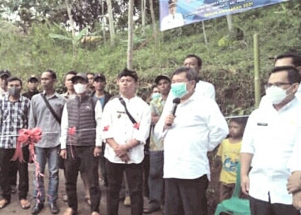Dalam peresmian jalan poros penghubung tersebut Rudi Gunawan menyampaikan sambutannya, la mengucap syukur atas peresmian jalan poros penghubung antar dua Kecamatan tersebut.
