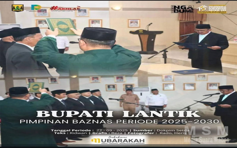 MediaSuaraMabes, Sukabumi – Pimpinan Badan Amil Zakat Nasional (Baznas) Kabupaten Sukabumi periode 2025-2030 resmi dilantik dan diambil sumpah jabatan oleh Bupati Sukabumi H. Asep Japar di Aula Setda,