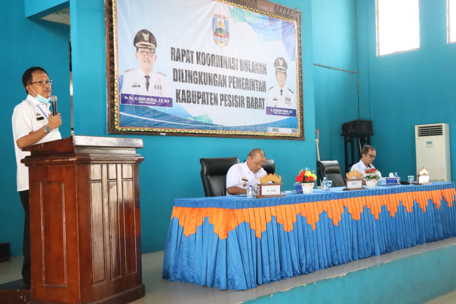 MediaSuaraMabes, Pesisir Barat- Bupati Pesisir Barat DR.Drs.Agus Istiqlal,SH.,MH. menghadiri acara Rapat Koordinasi Bulanan Tahun 2022 Kabupaten Pesisir Barat. bertempat di Gedung Serba Guna Selalaw Kecamatan Pesisir Kamis ( 31/03/2022 ). Dalam sambutannya Bupati menyampaikan, Pada Rapat Bulanan hari ini merupakan kegiatan rutin yang kita lakukan di kabupaten pesisir barat. pada kesempatan ini saya mengajak kita semua, untuk terus berbenah diri terutama dalam hal meningkatkan akuntabilitas kinerja dan pelayanan publik agar semakin baik, semakin responsif dan memuaskan. selanjutnya, mari kita tingkatkan kinerja demi mewujudkan percepatan pembangunan yang ada di kabupaten pesisir barat sehingga kita dapat mengejar ketertinggalan dengan kabupaten- kabupaten lain yang berada di Negara Kesatuan Republik Indonesia (NKRI) ini.