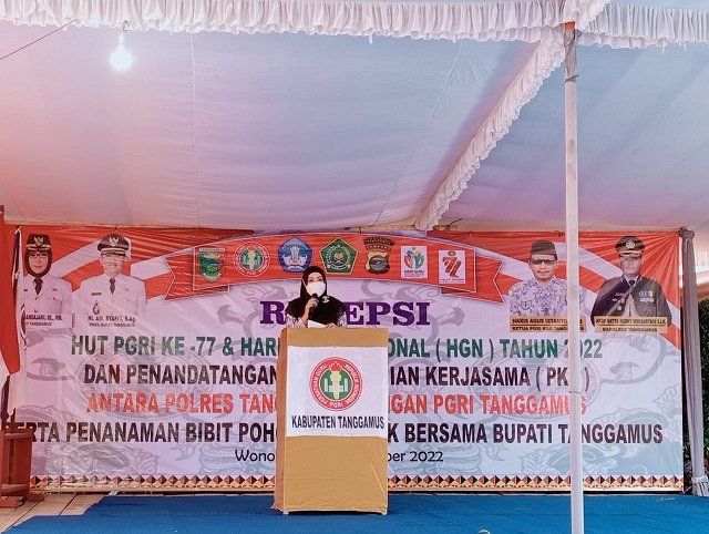 Bupati Tanggamus Hj. Dewi Handayani SE dalam sambutannya, Saya dan Jajaran pemerintah daerah kabupaten tanggamus mengucapkan Selamat Hari Guru Nasional dan HUT PGRI Ke-77 Kabupaten Tanggamus Tahun 2022 Dengan Tema “Guru Bangkit, Pulihkan Pendidikan, Indonesia Kuat-Indonesia Maju”.
