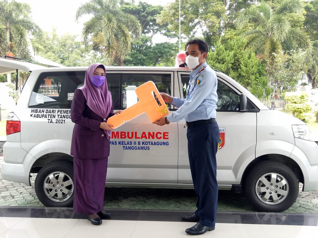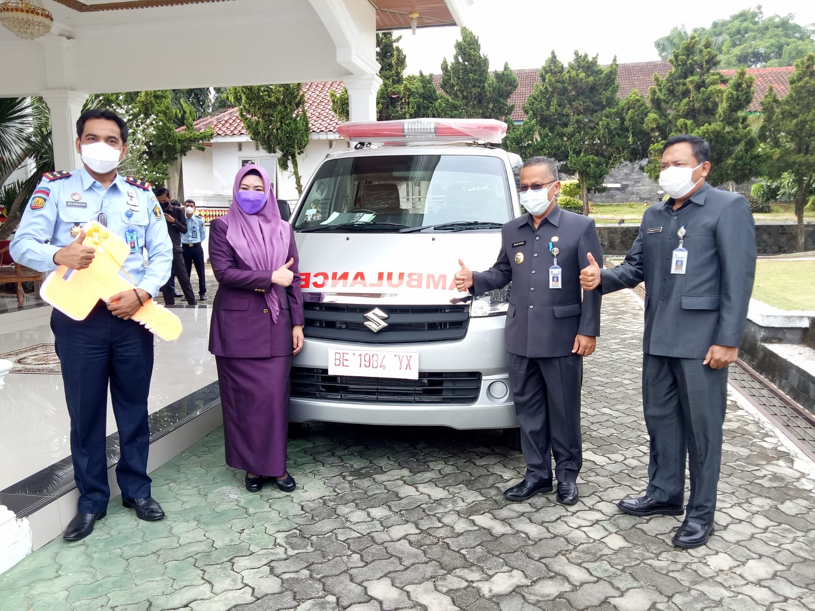 MediaSuaraMabes, Kotaagung — Bupati Tanggamus Hj. Dewi Handajani, menyerahkan satu unit Mobil Ambulance kepada Kepala Lembaga Pemasyarakatan (Lapas) Kelas IIB Kotaagung, Beni Nurrahman, di Rumah Dinas Bupati, di Kotaagung, Senin (27/9/2021).