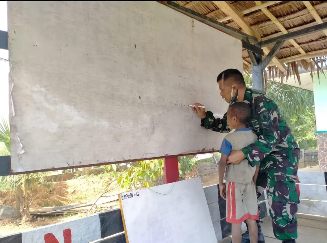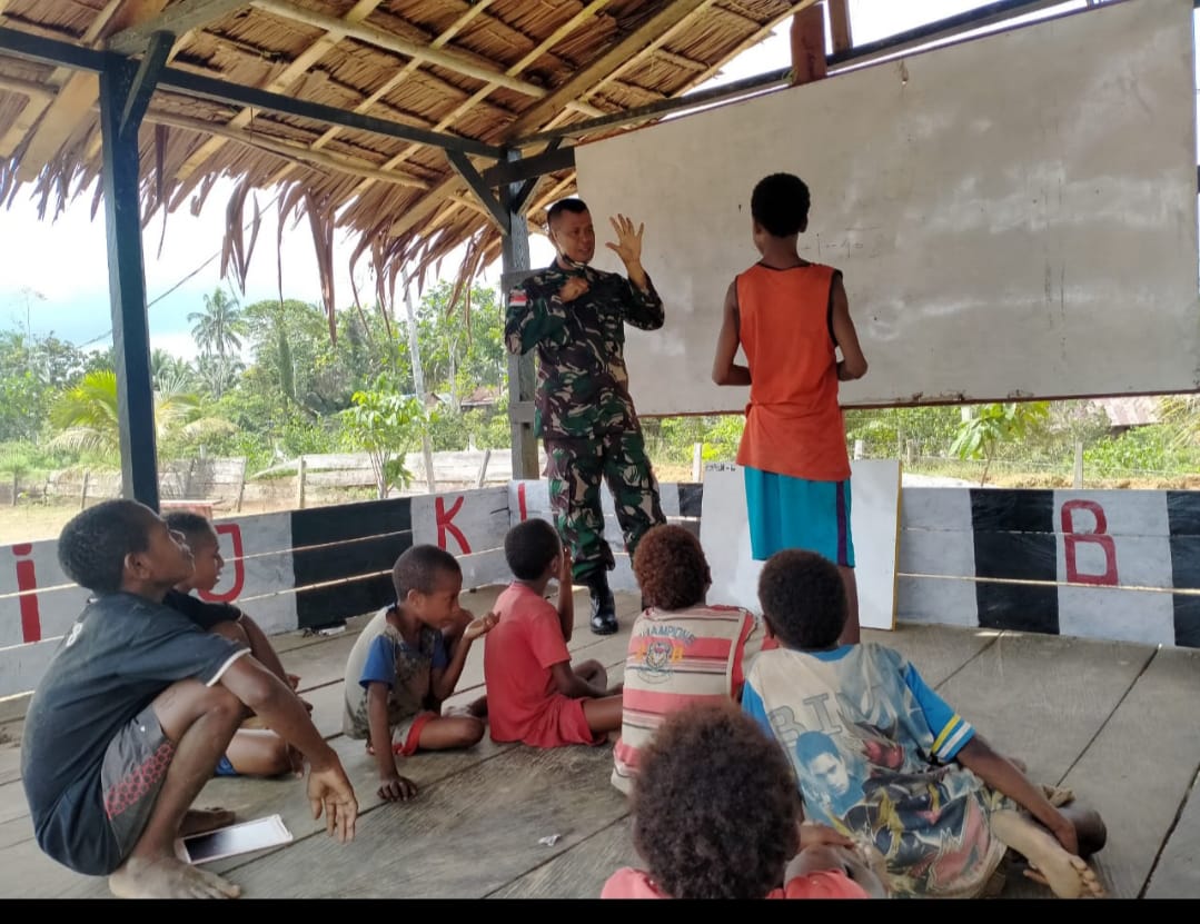 Sertu Nasrullah Wadanpos Yabanda memberikan bimbingan belajar kepada anak-anak di dalam ruang belajar Pos Yabanda, dengan memberikan materi pelajaran tentang dasar-dasar berhitung matematika serta memberikan sedikit pengetahuan tentang wawasan kebangsaan.