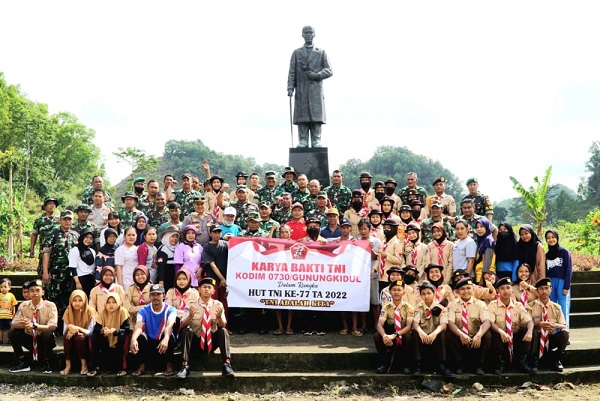 MediaSuaraMabes, Gunungkidul – Kodim 0730/Gunungkidul melaksanakan Karya Bakti TNI di Monumen Pangsar Patung Jend. Sudirman serta tanam pohon buah pada momentum peringatan HUT TNI Ke-77 tahun 2022 dengan tema ” TNI ADALAH KITA” yang dilaksanakan di Padukuhan Bedoyo, Kalurahan Bedoyo, Kapanewon Ponjong, Kabupaten Gunungkidul.(02/10/2022).