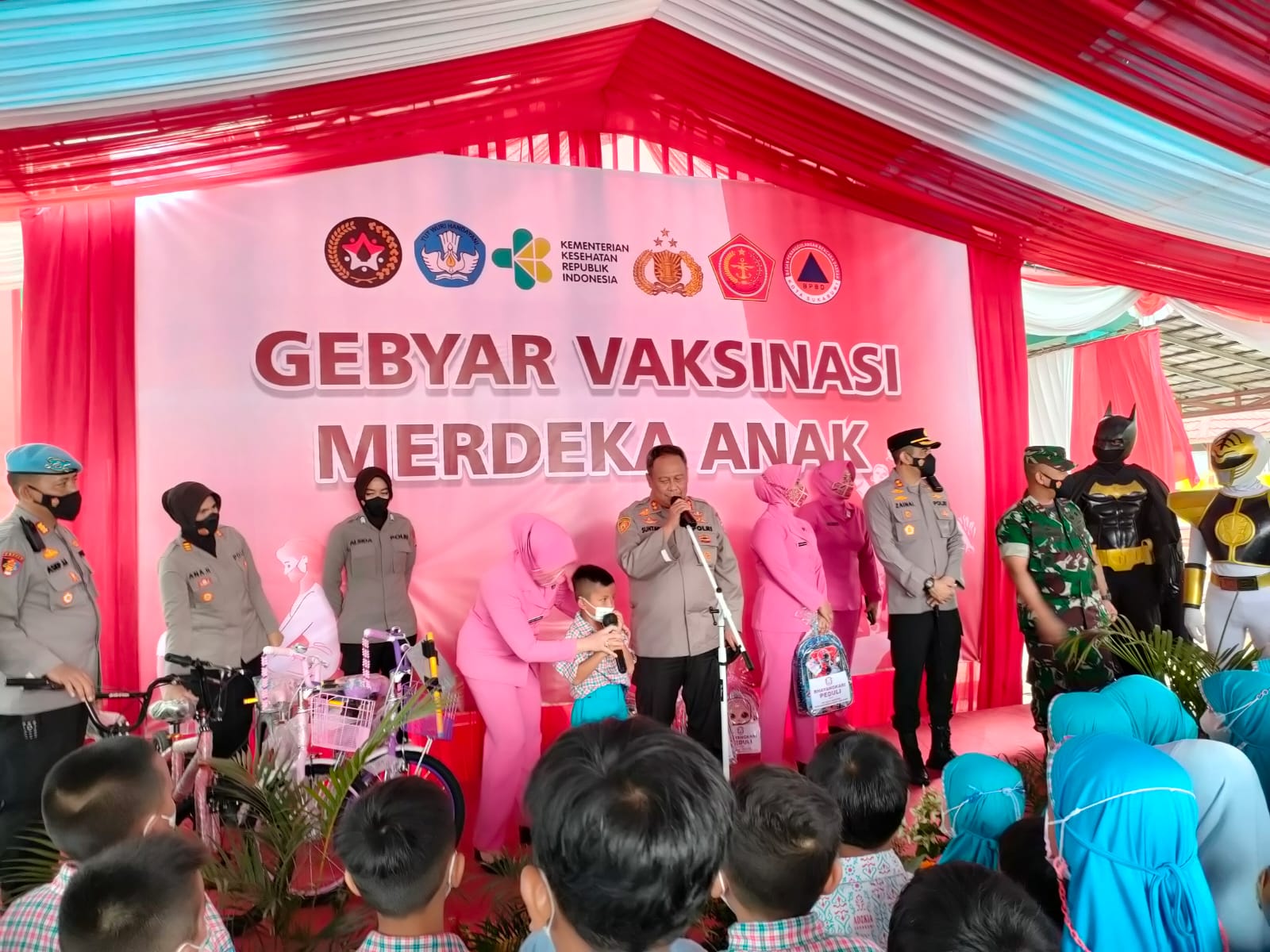 Kegiatan dilanjutkan peninjauan pelaksanaan vaksinasi umur 6-11 dan pemberian hadiah untuk anak-anak yang bisa menjawab pertanyaan bapak Kapolda .