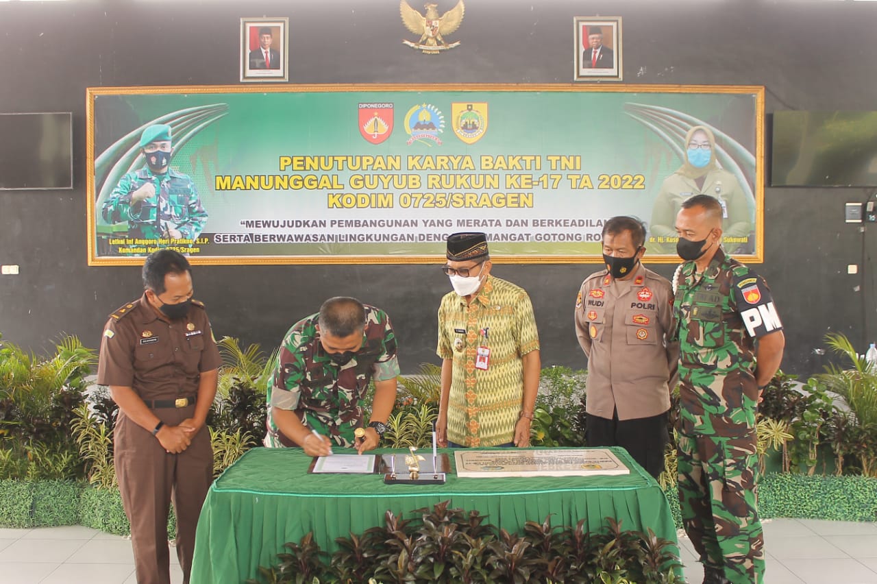 Agenda itu ditandai dengan penandatanganan prasasti serta penyerahan hasil pekerjaan dari Dandim kepada wakil Bupati Sragen H. Suroto dan tampak hadir dalam penyerahan seperti Camat Gondang, Kapolsek, Danramil, Kades Wonotolo serta tamu undangan lainnya.