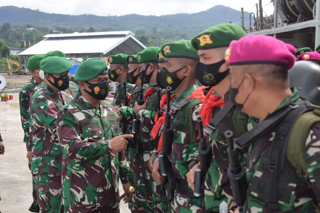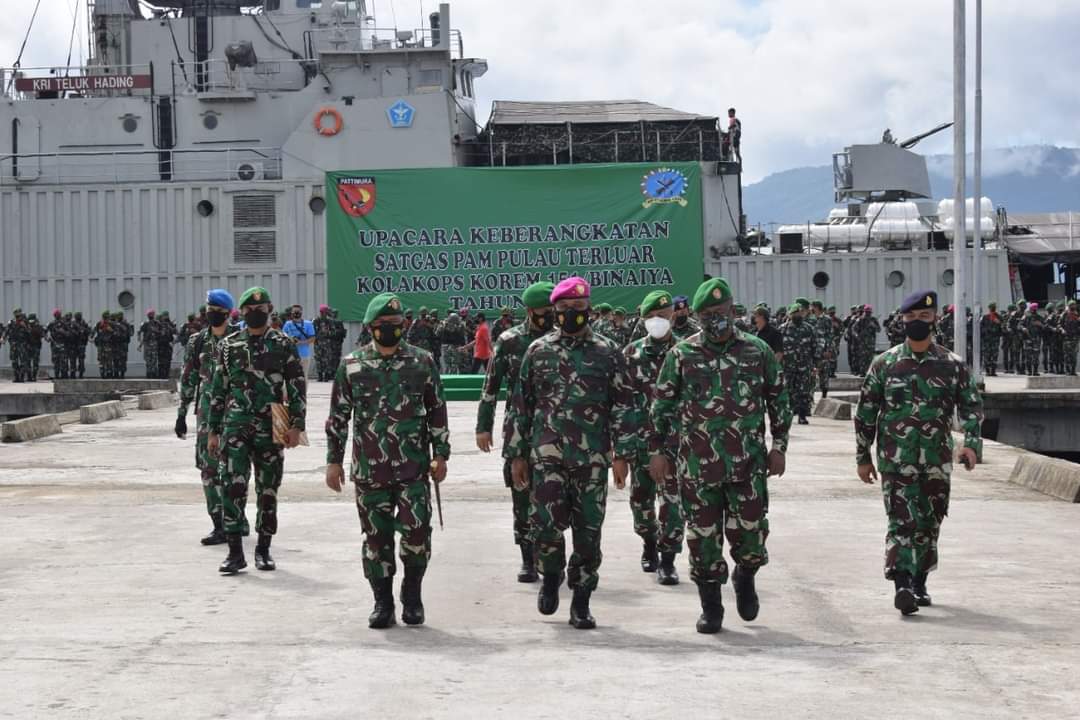 MediaSuaraMabes, Ambon – /Media Humas Polri/Komandan Komando Pelaksana Operasi (Dankolakops) Korem 151/Binaiya, Brigjen Arnold A. P. Ritiauw pimpin Upacara Pemberangkatan Satuan Tugas Operasi Pengamanan Pulau-pulau terluar (Satgas Pamputer) Kodam XVI/Pattimura yang berlangsung di Dermaga Guspurla Koarmada III, Kota Ambon. Senin (27/9/2021).
