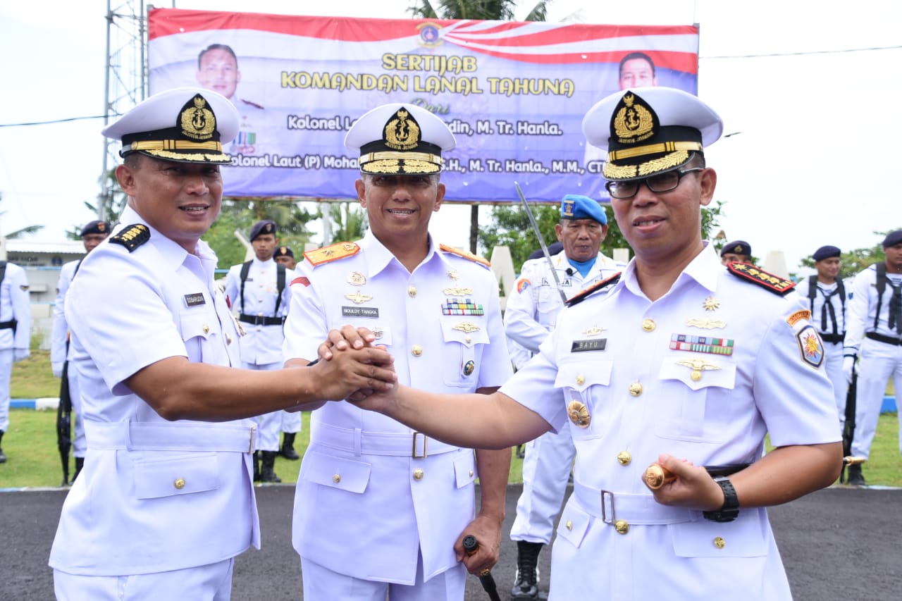 MediaSuaraMabes, Manado – Komandan Pangkalan Utama TNI AL (Danlantamal) VIII Manado Laksma TNI Nouldy J. Tangka memimpin Serah Terima Jabatan (Sertijab) Komandan Pangkalan TNI AL (Danlanal) Tahuna dari Kolonel Laut (P) Sobarudin M.Tr.Hanla kepada Kolonel Laut (P) Mohamad Bayu P., S.H., M.Tr.Hanla., M.M., CTMP, dalam sebuah upacara yang digelar di Markas Komando Lanal Tahuna Jl. Tatehewoba, Kel. Bungalawang, Kec. Tahuna, Kab. Kepulauan Sangihe, Sulawesi Utara. Sabtu (24/9/2022)