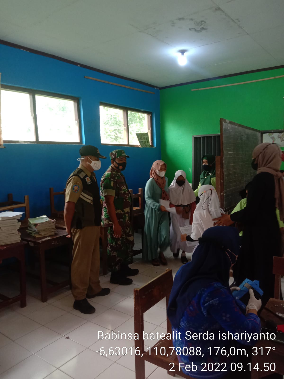 MediaSuaraMabes, Jepara – Komandan Koramil 03 Batealit Kpt Chb Purwanto didampingi Babinsa Serda Ishariyanto bersama Forkopimcam melakukan kegiatan tinjauan vaksinasi dosis 1 jenis Sinovac kepada siswa sekolah dasar, yang digelar di Desa Batealit kecamatan Batealit. Rabu, 02/02/2022.