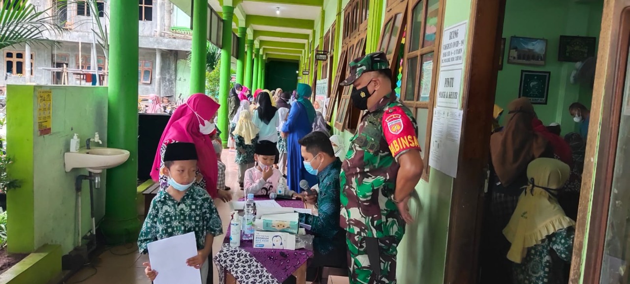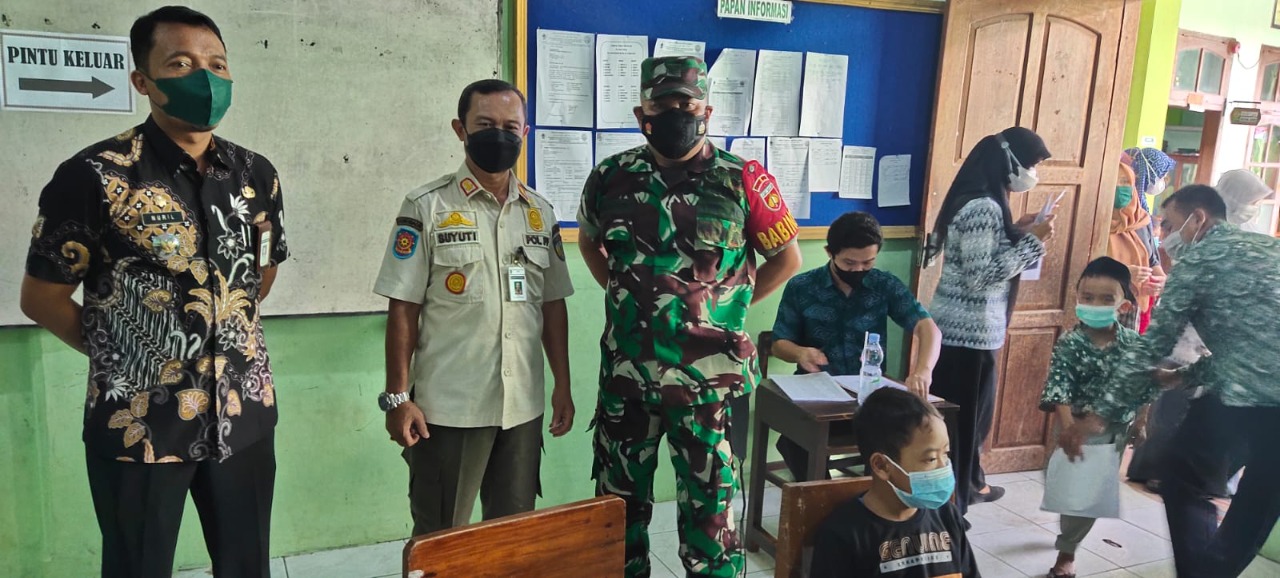 Danramil 11/Tahunan Kapten Inf Mashudi bersama Forkopimcam Tahunan monitoring pelaksanaan vaksinasi bagi siswa-siswi MI Masalikil Huda 1 Tahunan yang berada di Jl. Sukarno Hatta, Kecamatan Tahunan. Kamis (20/1/2022).