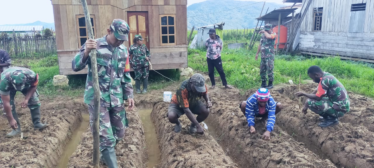 Para personil Koramil ini mulai melakukan penanaman bibit jagung diatas lahan seluas 15×10 M yang terletak di Kampung Awabutu, Distrik Paniai Timur, Kabupaten Paniai. Kamis (28/07/2022).